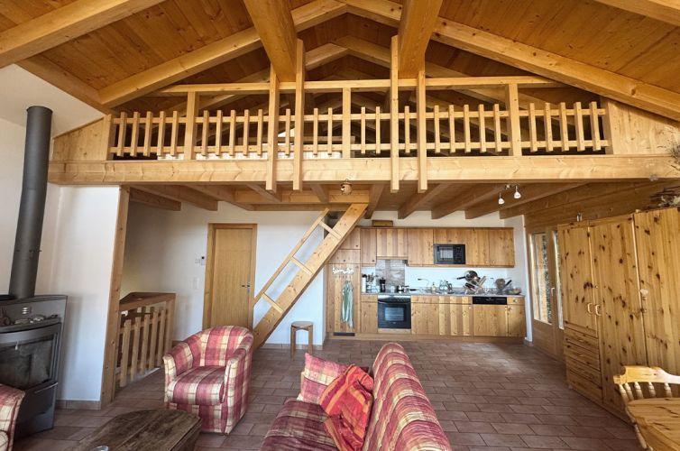 La cuisine est entièrement équipée, et le salon s’organise autour d’un poêle à bois (bois fourni), parfait après une journée en montagne. Pour plus de confort, le chalet offre également le Wi-Fi et une petite télévision.